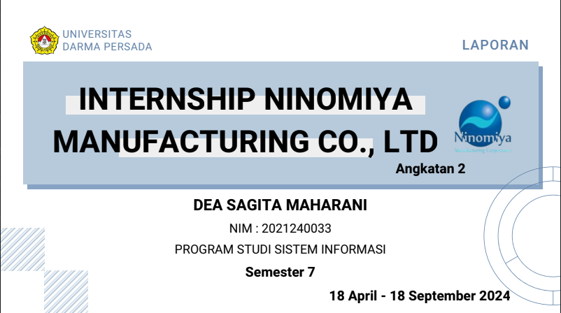 Mahasiswa Universitas Darma Persada (UNSADA) yang mengikuti program magang di Ninomiya, Jepang, merupakan bagian dari upaya internasionalisasi kampus dan penguatan kompetensi global. Program ini memberikan pengalaman kerja nyata di lingkungan profesional Jepang, khususnya di bidang teknik dan manufaktur, sekaligus menjadi sarana penguatan budaya kerja, disiplin, dan etos kerja yang tinggi. Selain itu, mahasiswa juga berkesempatan memperdalam keterampilan bahasa Jepang, memperluas jaringan internasional, serta menumbuhkan jiwa mandiri dan tanggung jawab. Magang di Ninomiya menjadi langkah strategis untuk mempersiapkan mahasiswa menjadi lulusan yang unggul dan siap bersaing di tingkat global.